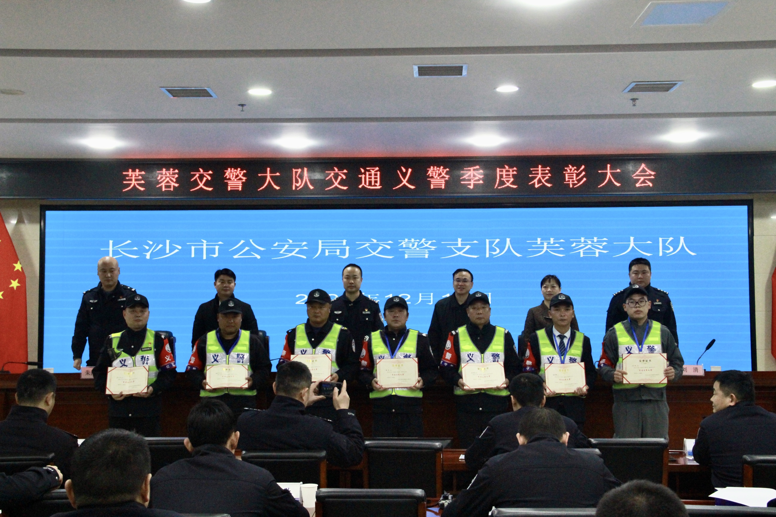 快讯(保卫工作部)12月10日上午,长沙市公安局交警支队芙蓉大队召开交通义警季度表彰大会,芙蓉交警大队大队长张星、副大队长刘清、副大队长朱浩然、各交警中队中队长,以及芙蓉交通义警参加表彰大会。3044am永利集团官网党委委员、副校长吴波,保卫工作部部长胡建雄,副部长杨彩虹作为特邀嘉宾参加会议并在主席台就座。