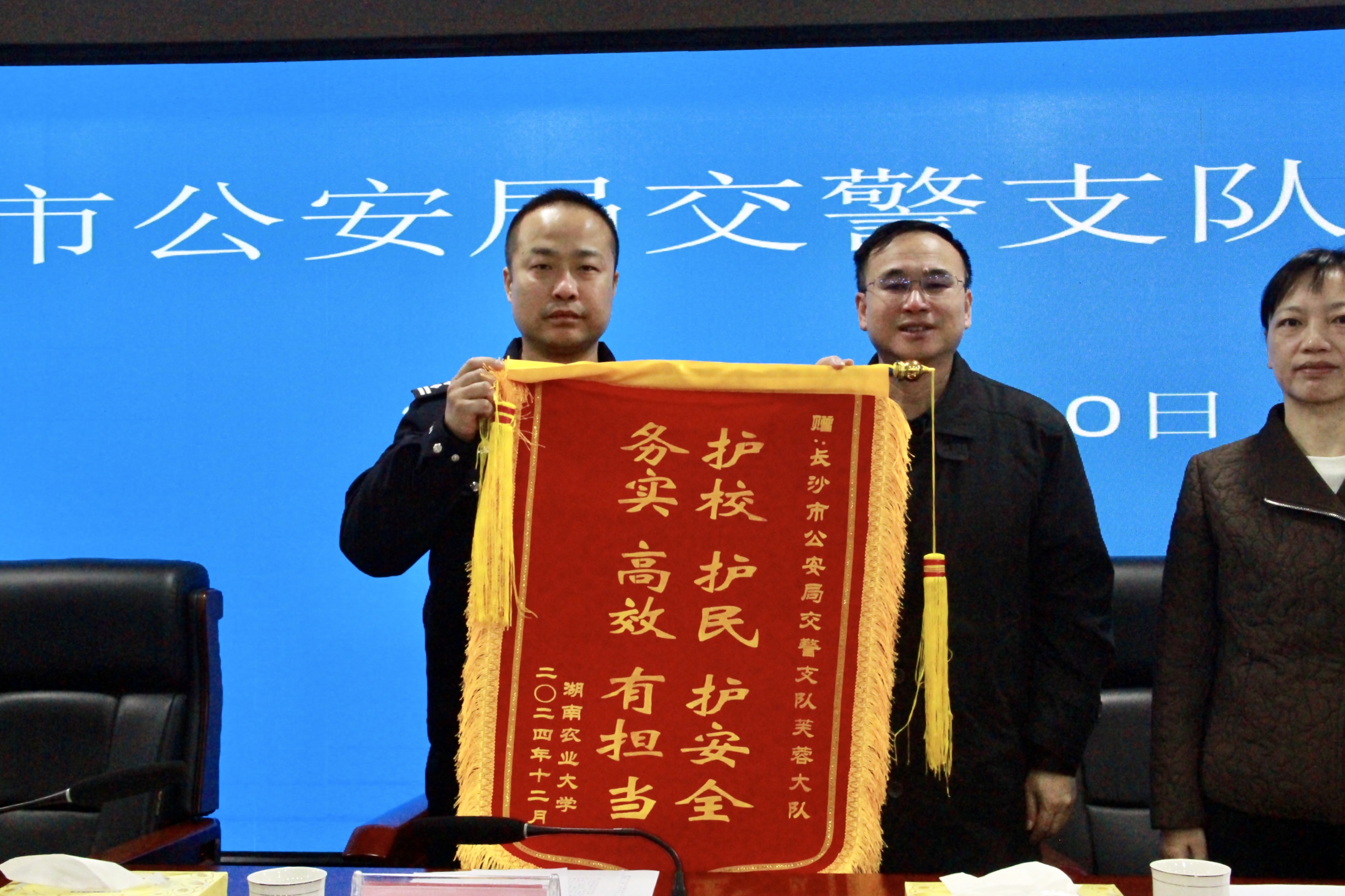 会上吴波副校长代表学校党委向芙蓉交警大队宣读了感谢信并赠予锦旗。感谢芙蓉交警大队为我校安全发展提供的指导和帮助,称赞芙蓉交警大队成立交警义警这一创新举措,提升了芙蓉区尤其是农大校园及周边区域交通环境治理水平,加深了警民联系,为校警联动协同发展起到了积极推动作用。
