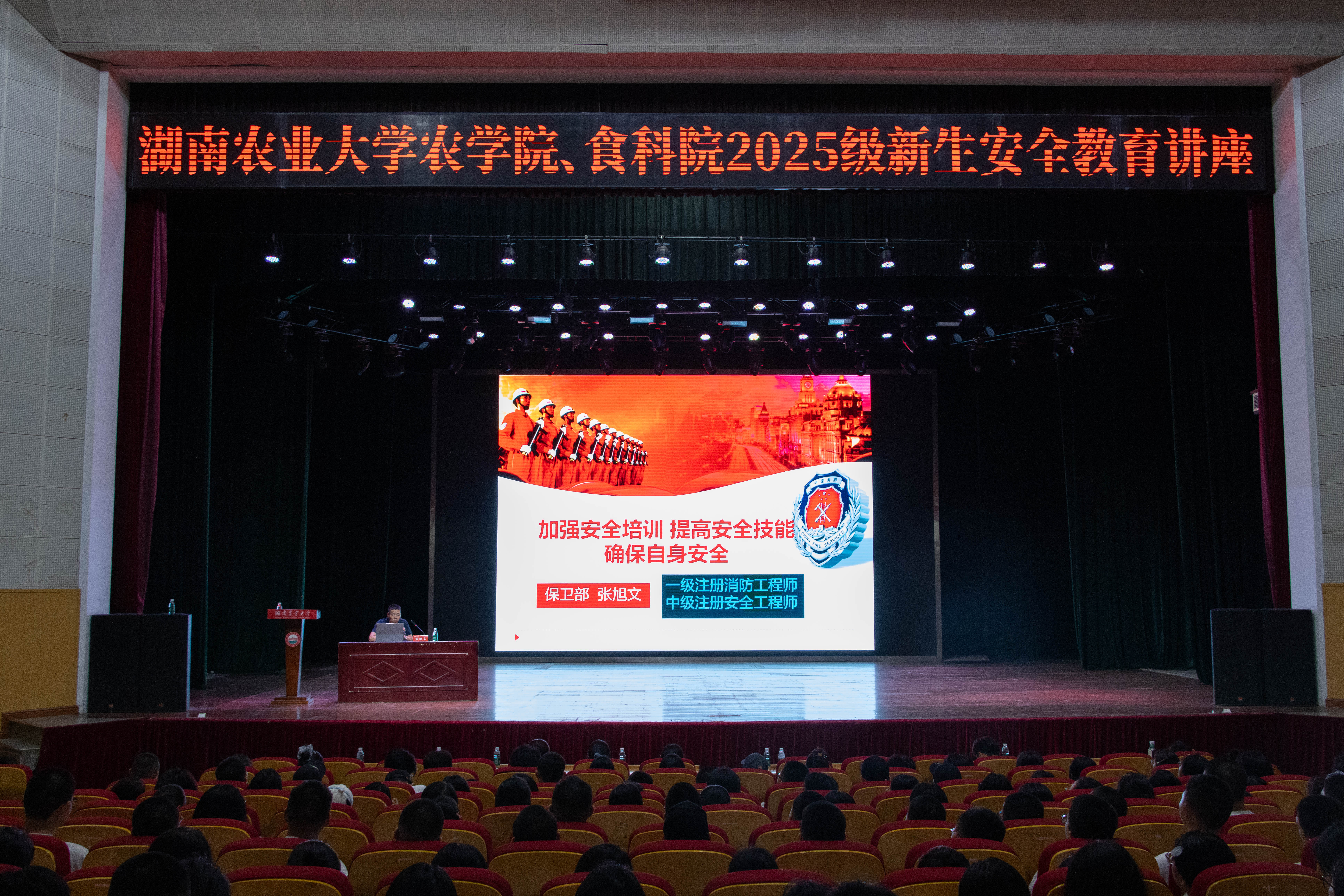 为进一步增强学生的安全意识,提升应对突发火情的自救互救能力,营造安全稳定的校园科研环境,9月18日20点,保卫工作部张旭文老师,在学校大礼堂开展了以“加强安全培训提高安全技能确保自身安全”为主题的安全专题培训。农学院和食科院全体本科新生和研究生新生参加了本次培训。